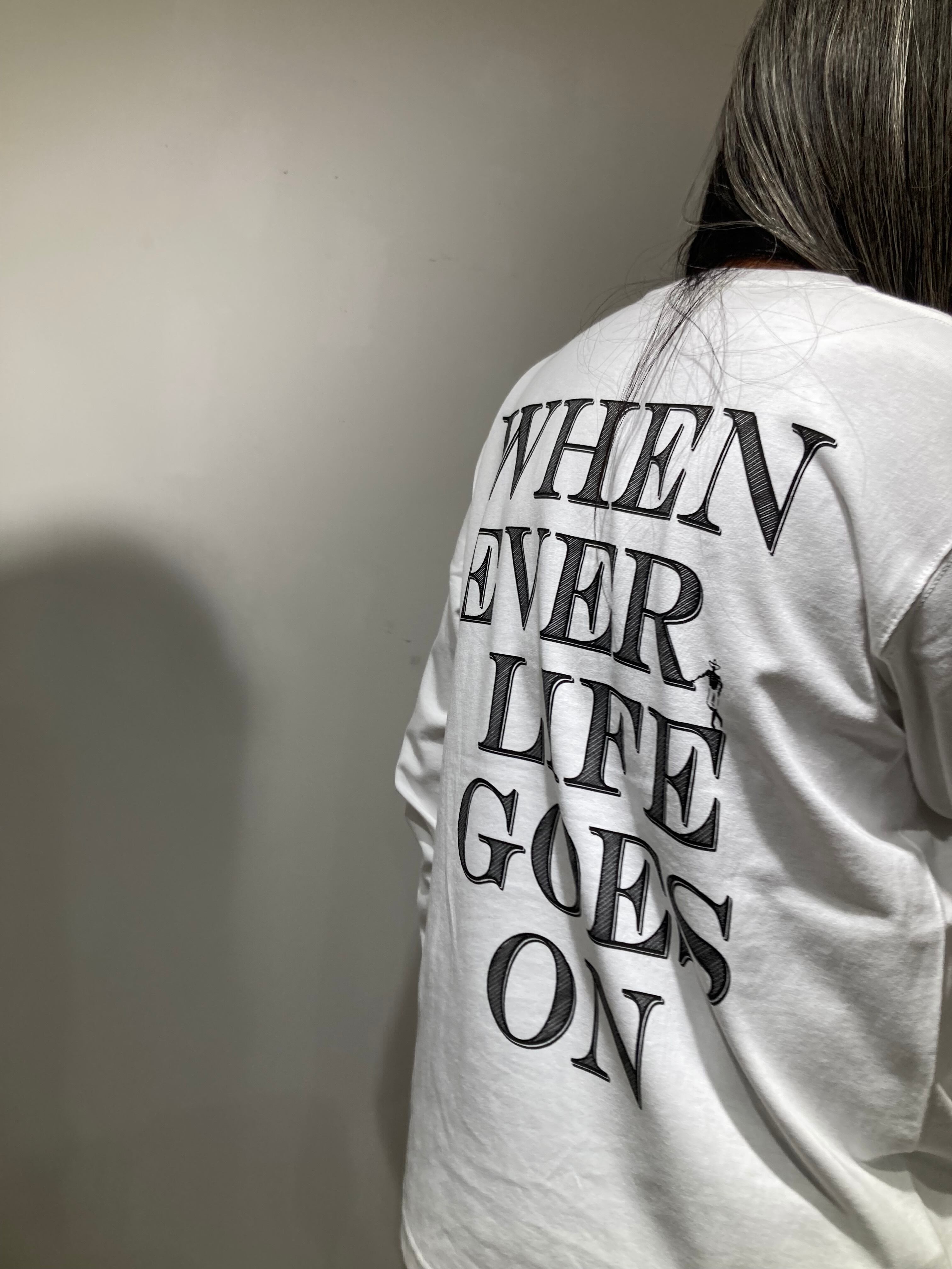 “ 人生は続く ”というメッセージがバック一面にプリントされています。